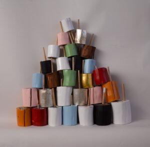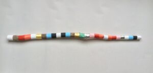 De sculpturen van Frank Bezemer bestaan uit 28 elementen die zich meer of minder van elkaar onderscheiden. Je kan ze in een piramidevorm stapelen.  Onderaan zeven elementen, dan zes, etc.  Of, je verbindt ze met elkaar tot een staf, scepter of antenne!